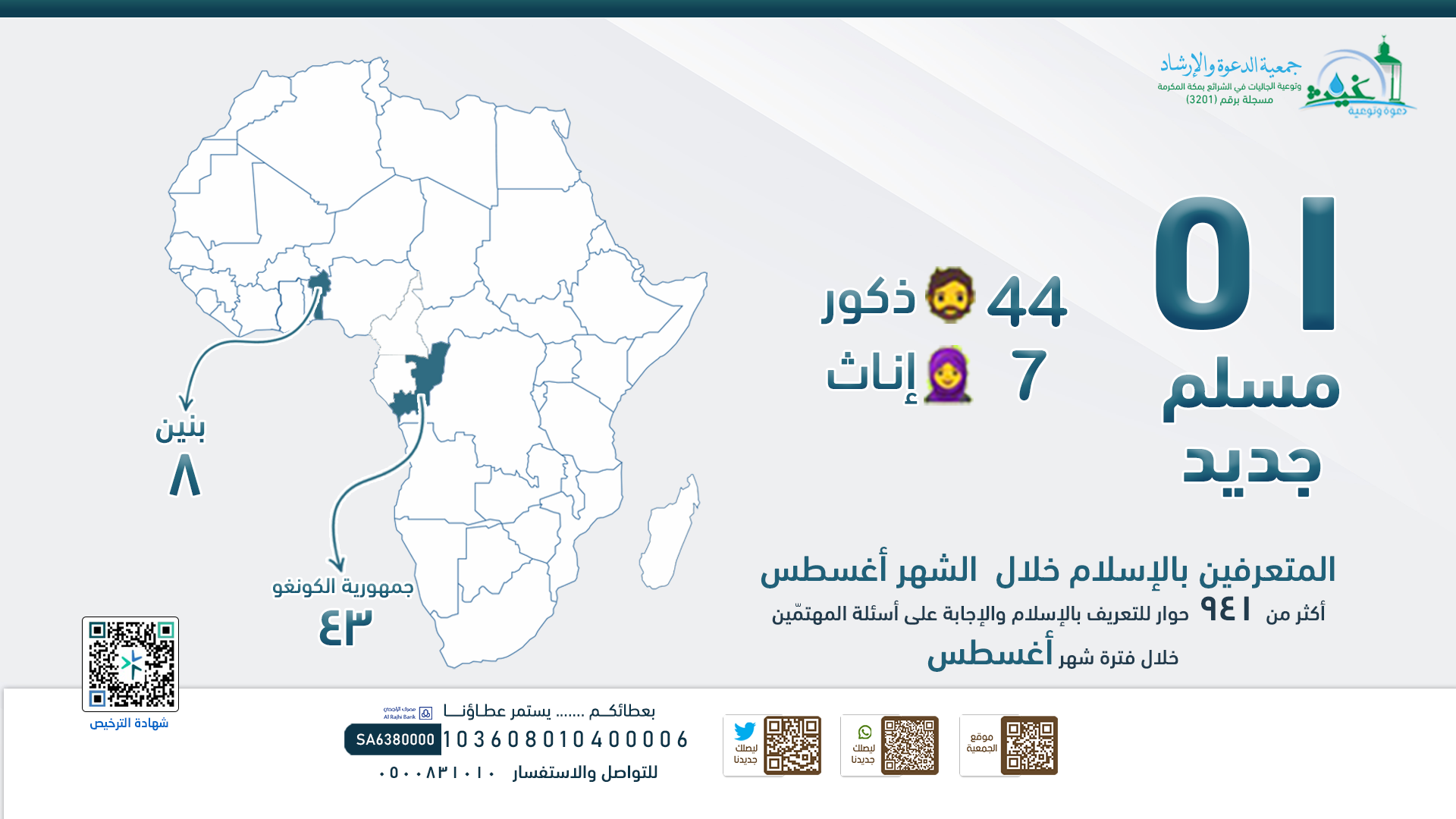 بفضل الله ثم بجهودكم المباركة، دخل في الإسلام خلال شهر أغسطس 51 مسلمًا جديدًا نسأل الله أن يثبّتهم على دينه، ويشرح صدورهم للحق.